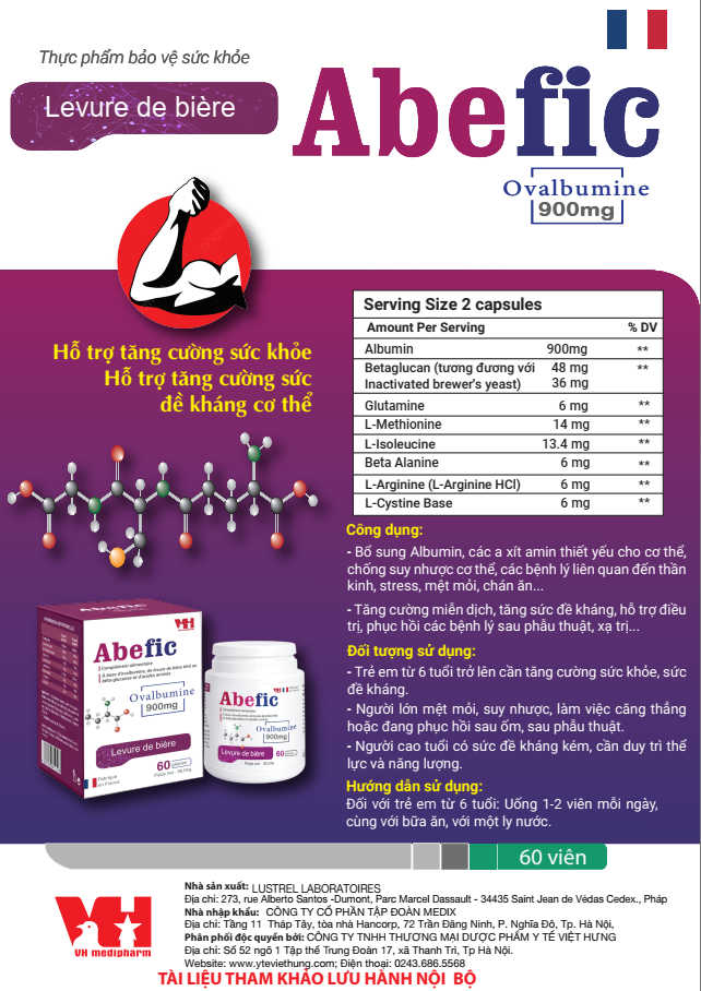 Abefic là thực phẩm bảo vệ sức khỏe cao cấp đến từ Pháp, chứa Ovalbumine 900mg kết hợp Betaglucan, Glutamine và các axit amin thiết yếu, giúp hỗ trợ tăng cường miễn dịch, phục hồi sức khỏe và nâng cao thể trạng cho nhiều đối tượng.
